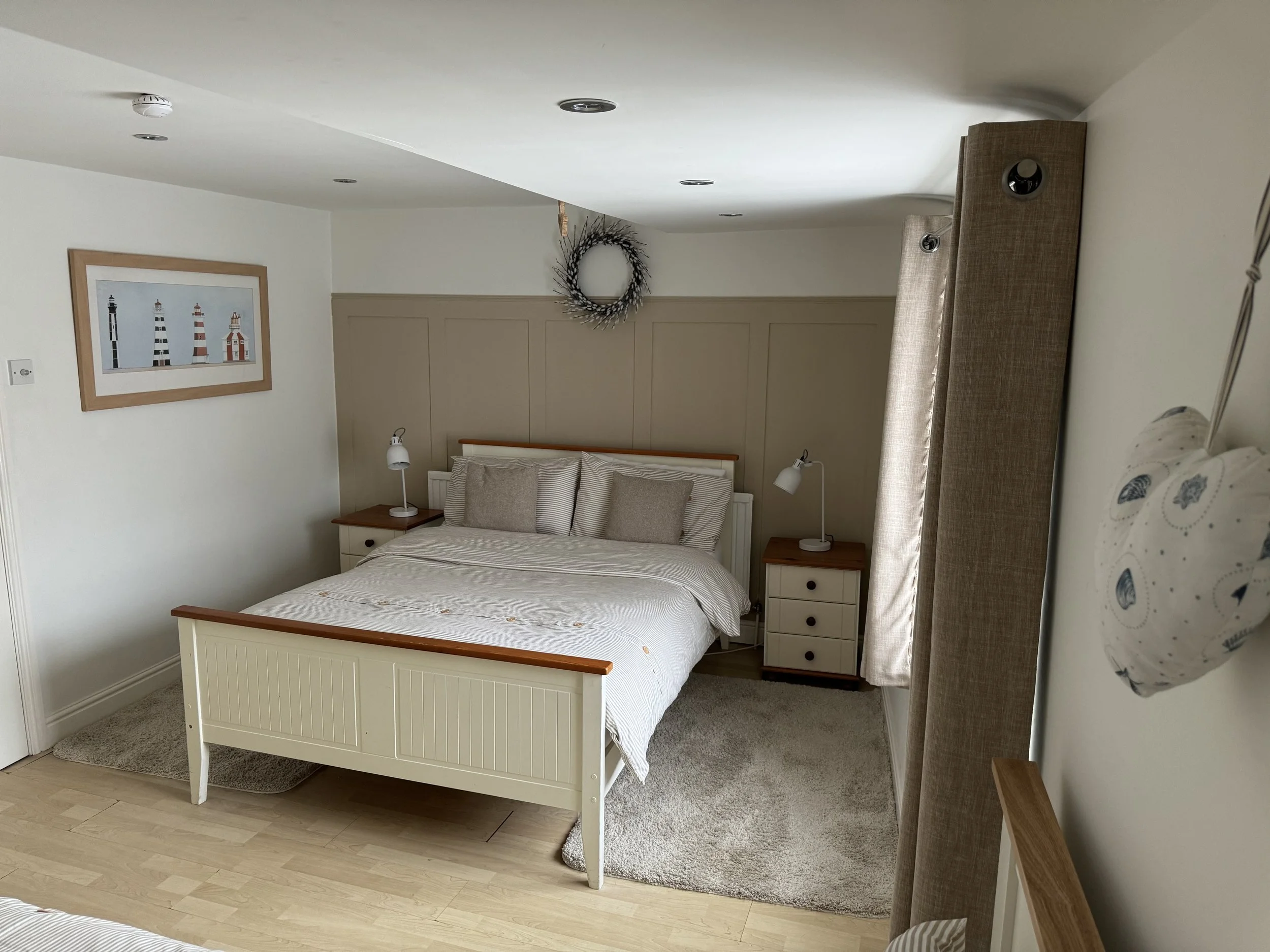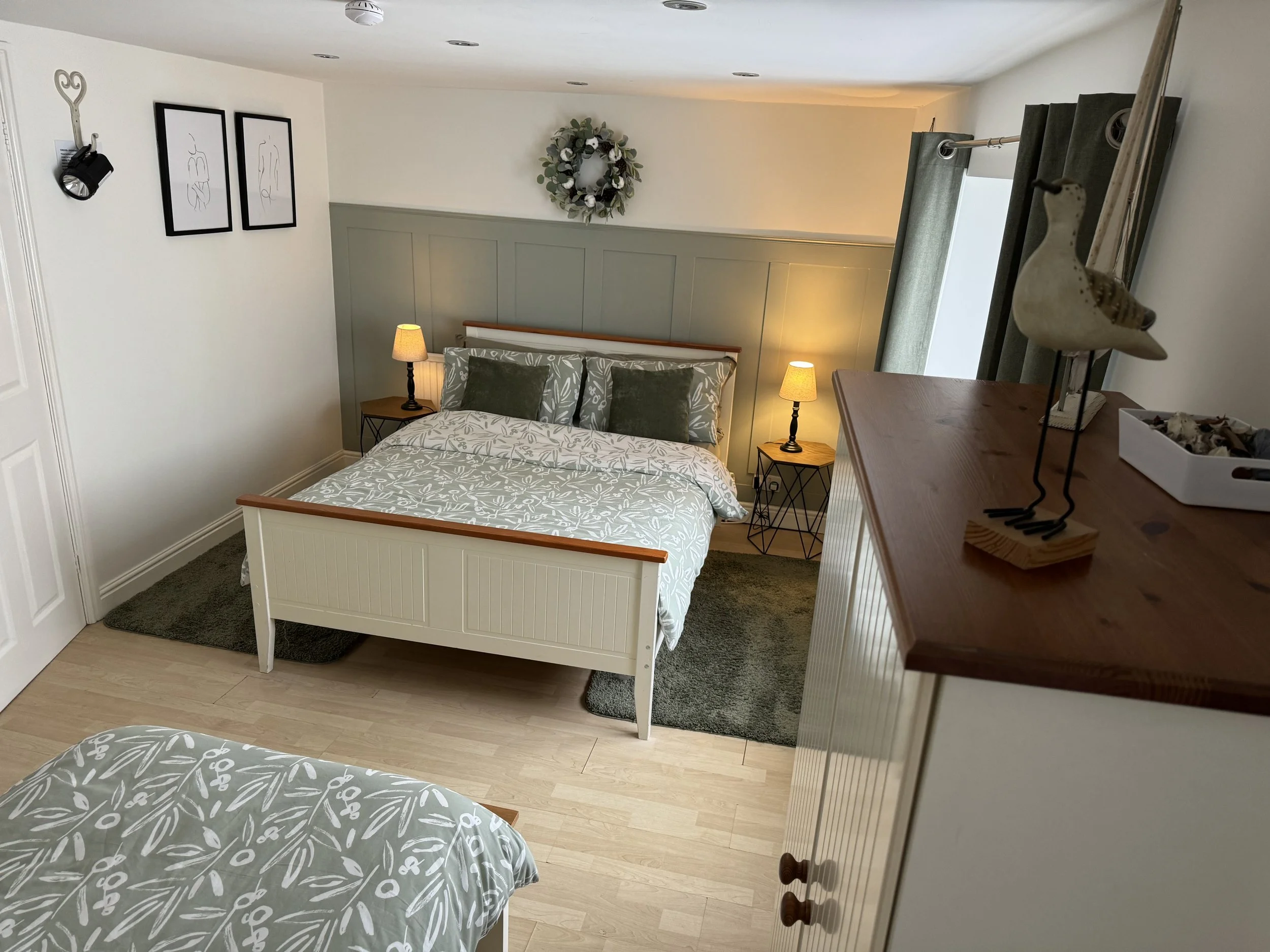 Bedroom 2 (Top Bedroom) - double bed, single bed, wardrobe, chest of drawers, lamps, dimmer lights, cot (optional), emergency exit to street level