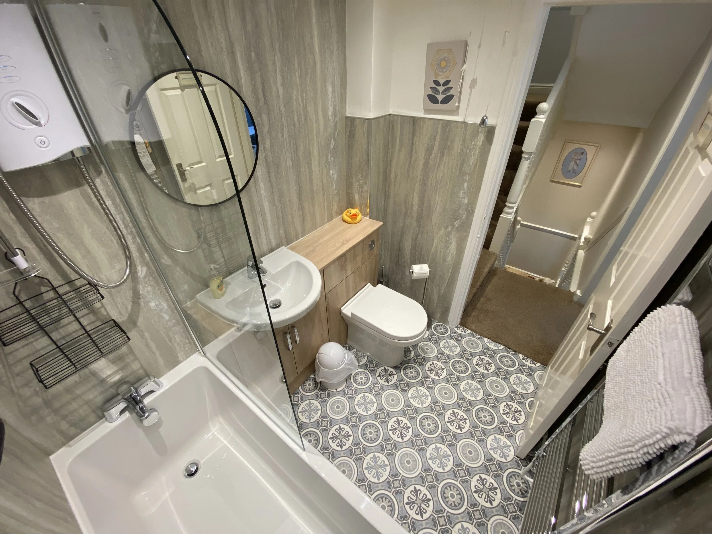 Access to Bathroom with shower, bath, sink and WC.